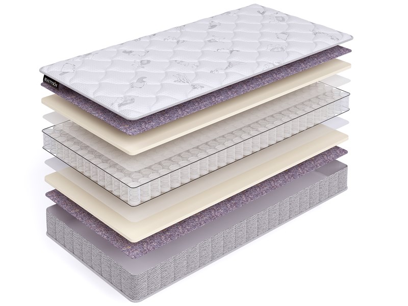 При производстве матраса использованы две уникальные технологии Бьютисон. Первая - усиления боковин матраса, которая позволяет отказаться от поролонового короба. Вертикальные пружины надолго сохраняют упругость. Вторая - сборка наполнителей без применения клея.