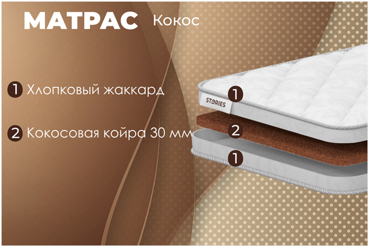 | Наполнитель и толщина | кокос, струтто, холлофайбер 6-8см | кокос, струтто, холлофайбер 6-8см + латекс (натуральный или искусственный), 6-12см | чередующиеся слои латекса(натурального или искусственного) и кокоса, 10-12см | пружинный блок, чередующиеся слои латекса и кокоса, 14-16см | ППУ или блоки независимых пружин с латексными и кокосовыми наполнителями, от 16см высотой |