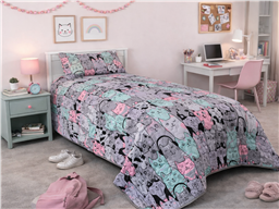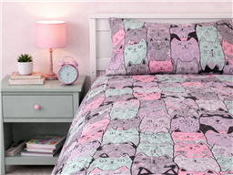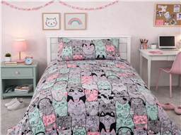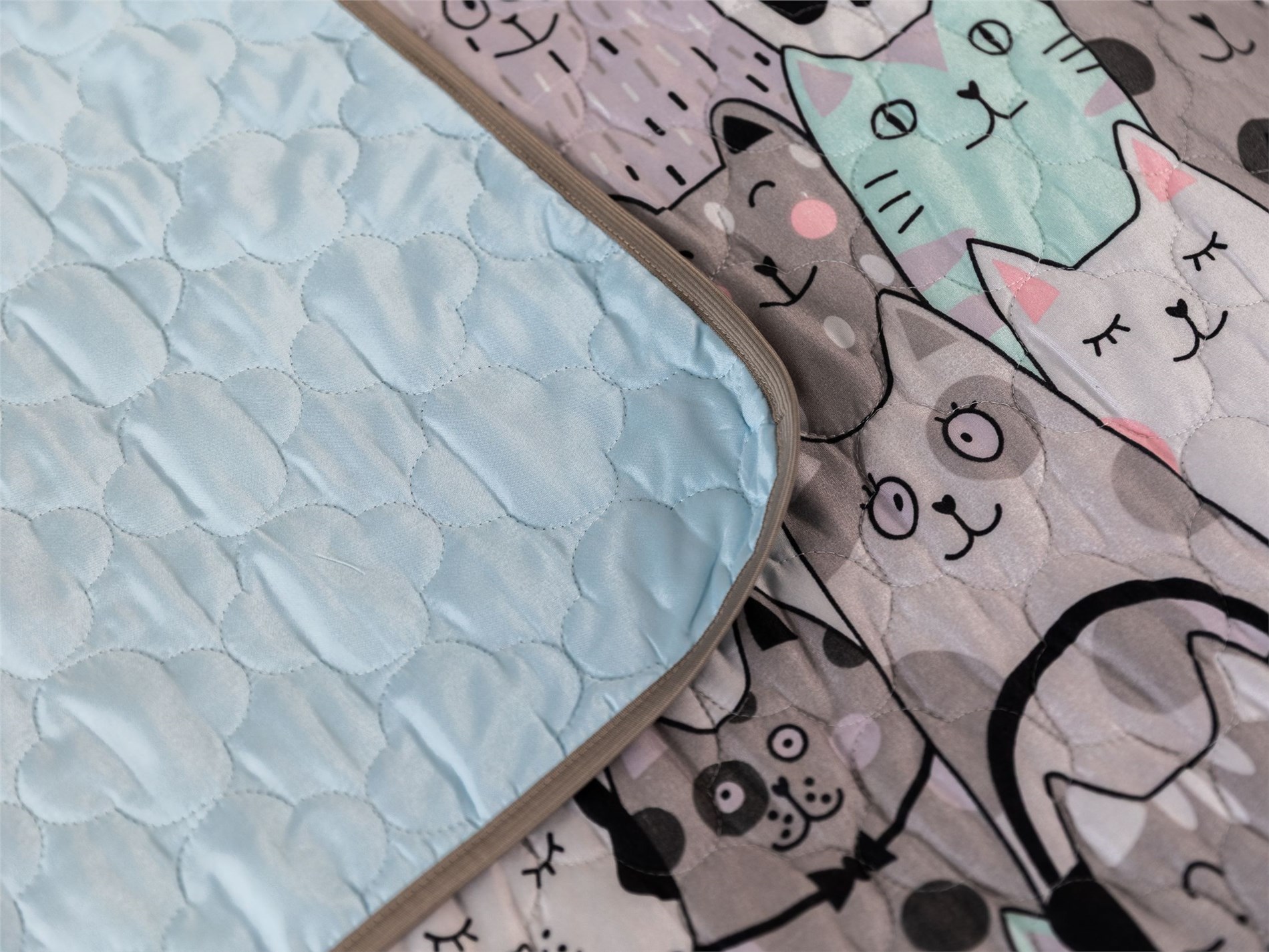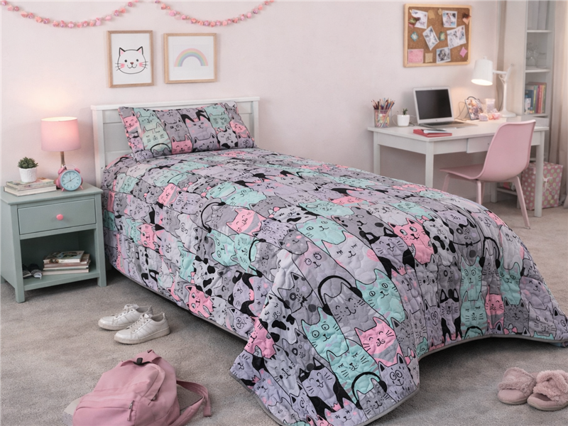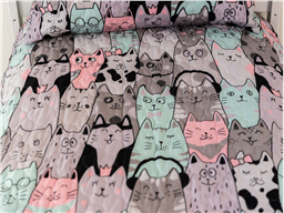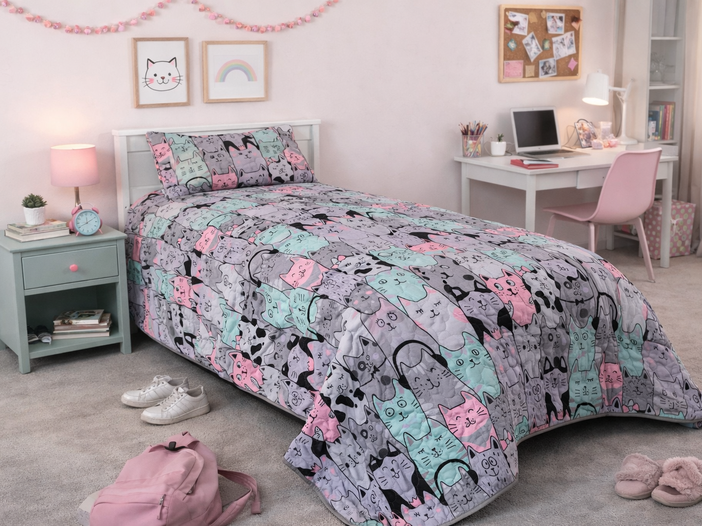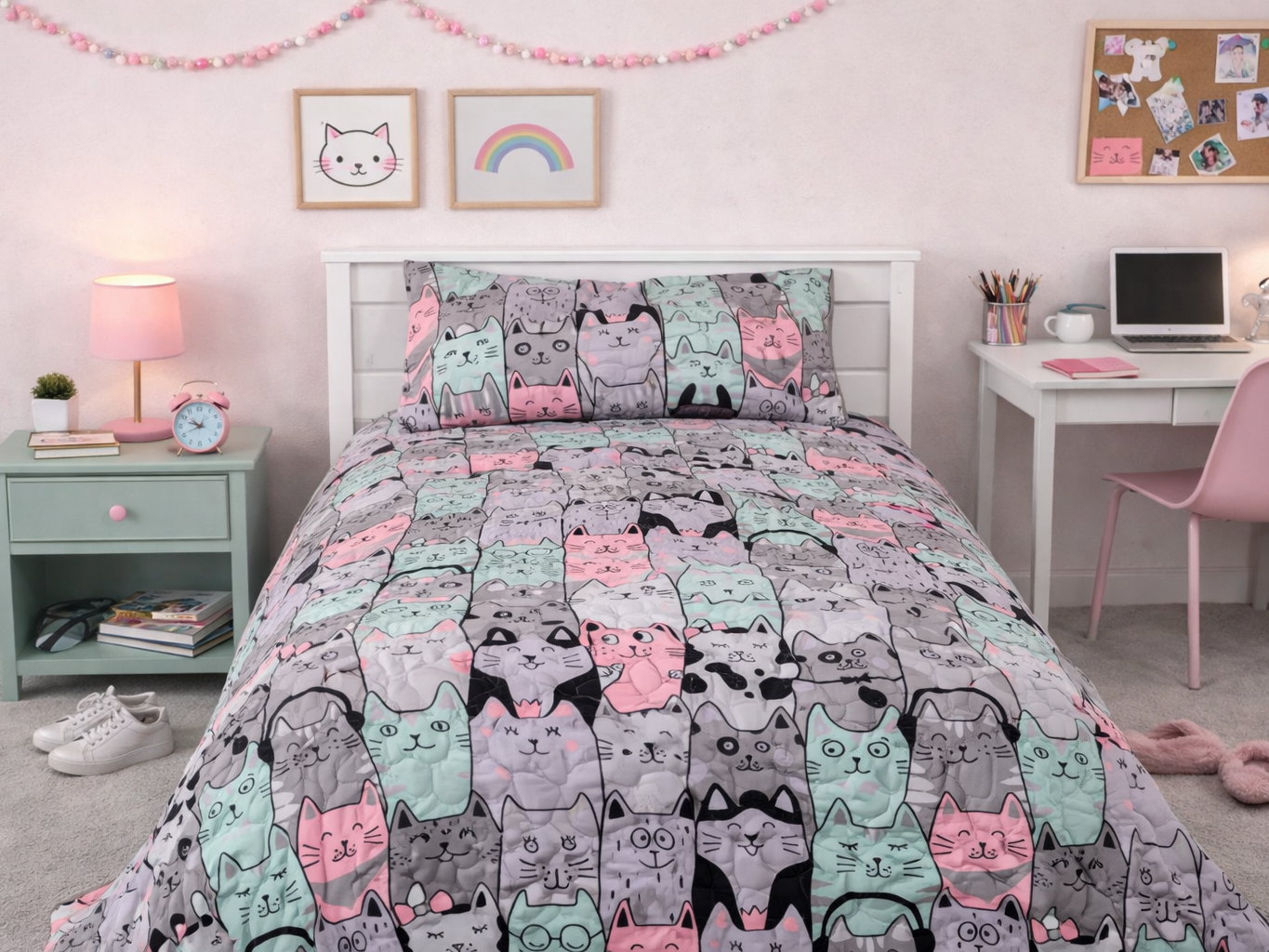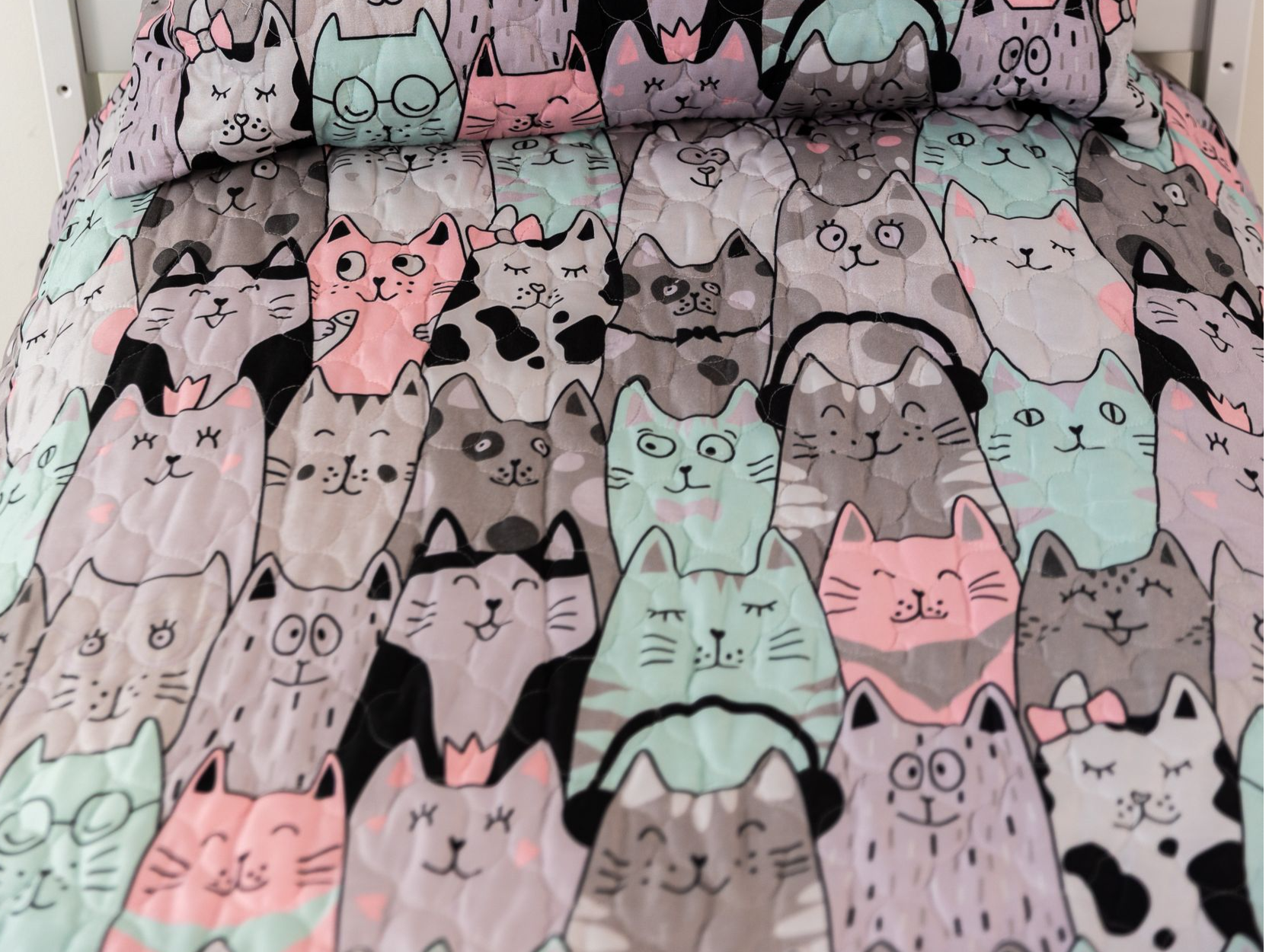 Очаровательные котики в серо-розово-мятной гамме создают спокойное настроение и легко сочетаются с современным интерьером детской или подростковой спальни.