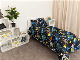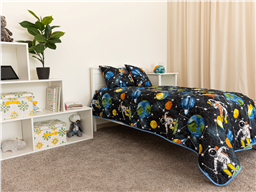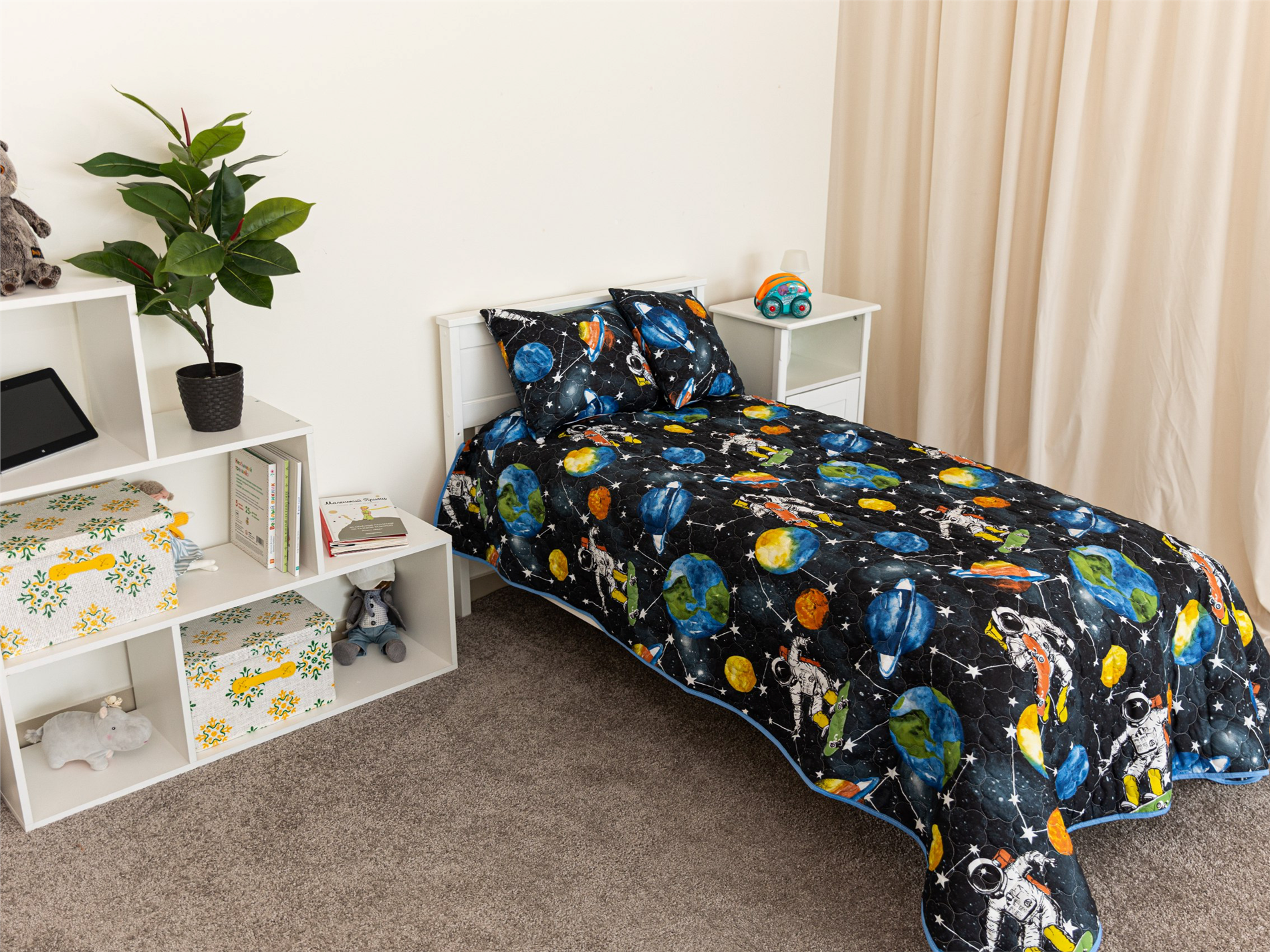 Покрывало с ярким космическим принтом создаёт настроение в детской комнате и делает кровать аккуратной за секунды. Ткань приятная на ощупь, не скользит и отлично держит форму, поэтому покрывало выглядит аккуратно даже при активном использовании.