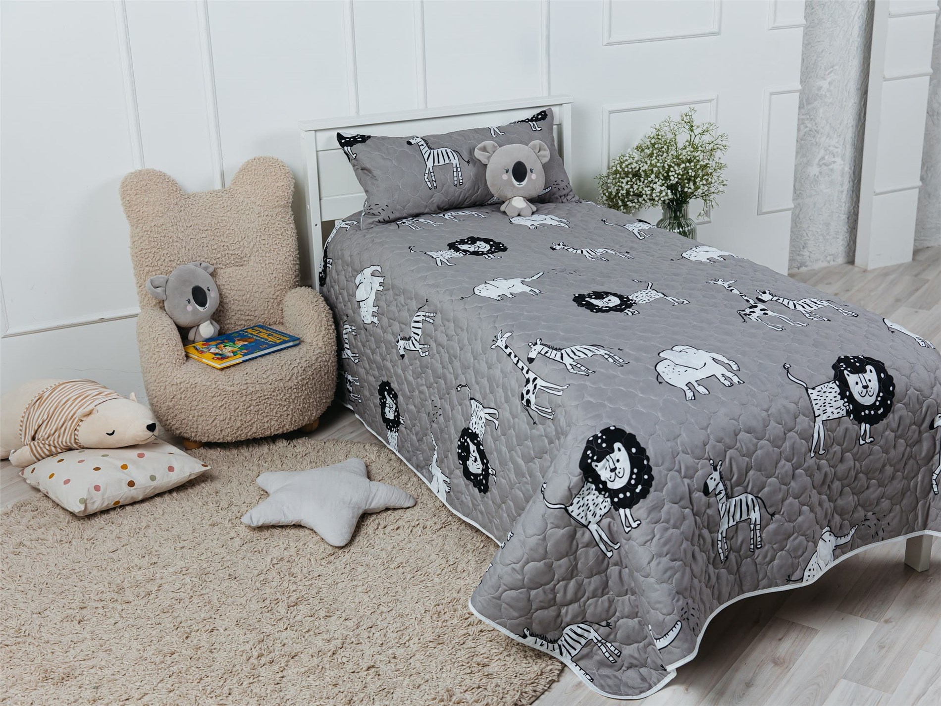 Создайте атмосферу весёлого сафари прямо в детской комнате! С этим покрывалом сон превращается в увлекательное путешествие по саванне, где дружелюбные львы, жирафы, зебры и слоны сопровождают ребёнка в мире грёз.