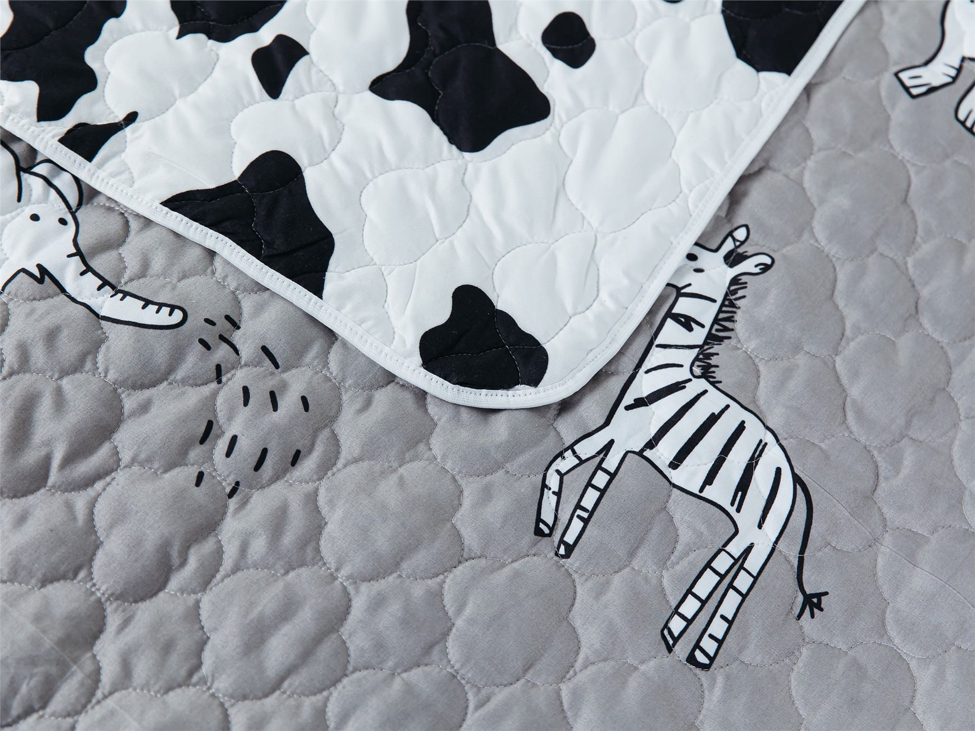 Двустороннее покрывало: вторая сторона с чёрно-белым «пятнистым» принтом в стиле сафари.