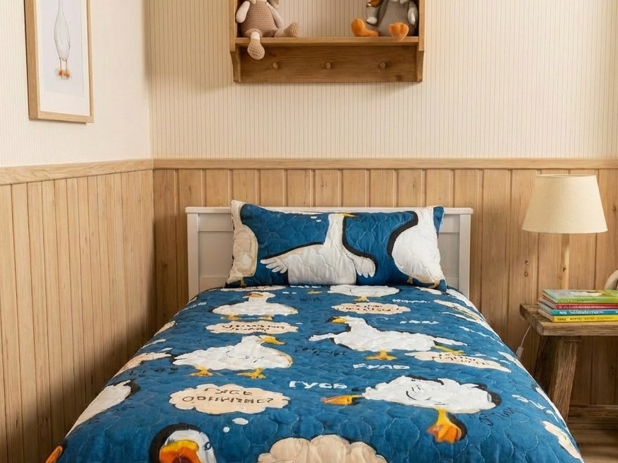 Яркое и необычное покрывало с забавным гусём сразу привлекает внимание и делает интерьер детской живым и современным.
