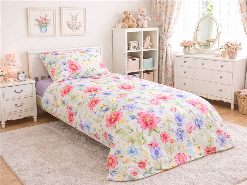 Комплект «Луговые Цветы» создан для нежных снов и уютной атмосферы в детской комнате. Воздушный цветочный принт с яркими бутонами и мягкими пастельными оттенками напоминает летний луг, наполненный солнцем, теплом и спокойствием. Такая кровать мгновенно становится любимым местом отдыха.