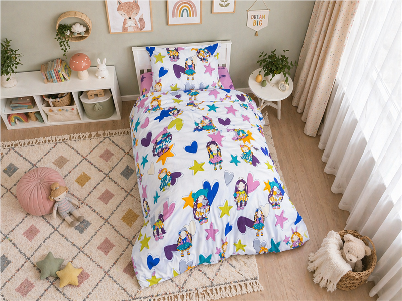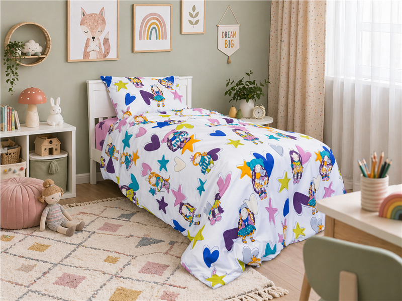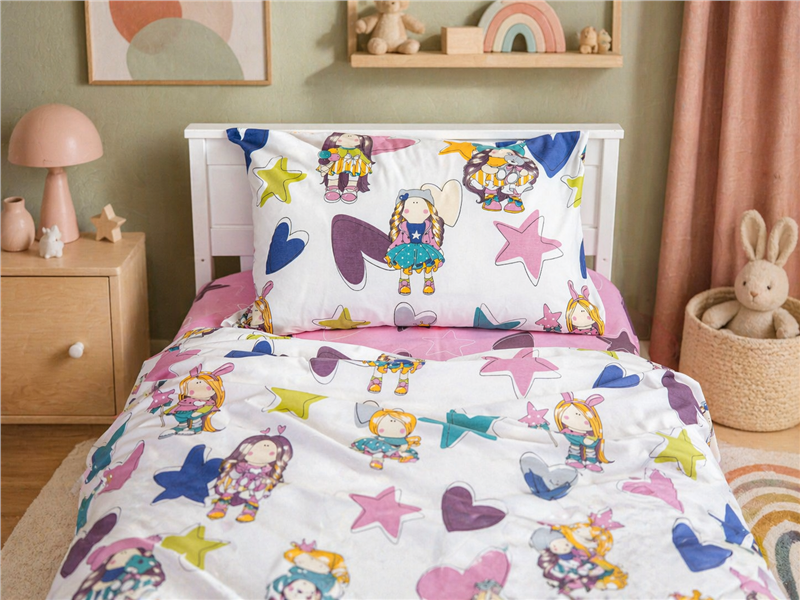Подарите ребёнку уютное пространство для сна с очаровательным комплектом «Куколки». Нежный дизайн с милыми куколками, звёздами и сердечками наполняет комнату радостью, фантазией и теплом. Такой комплект мгновенно преображает детскую и делает её по-настоящему волшебной.