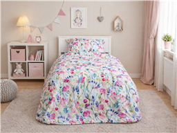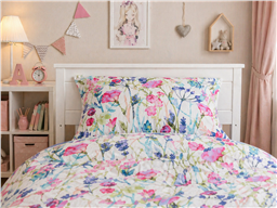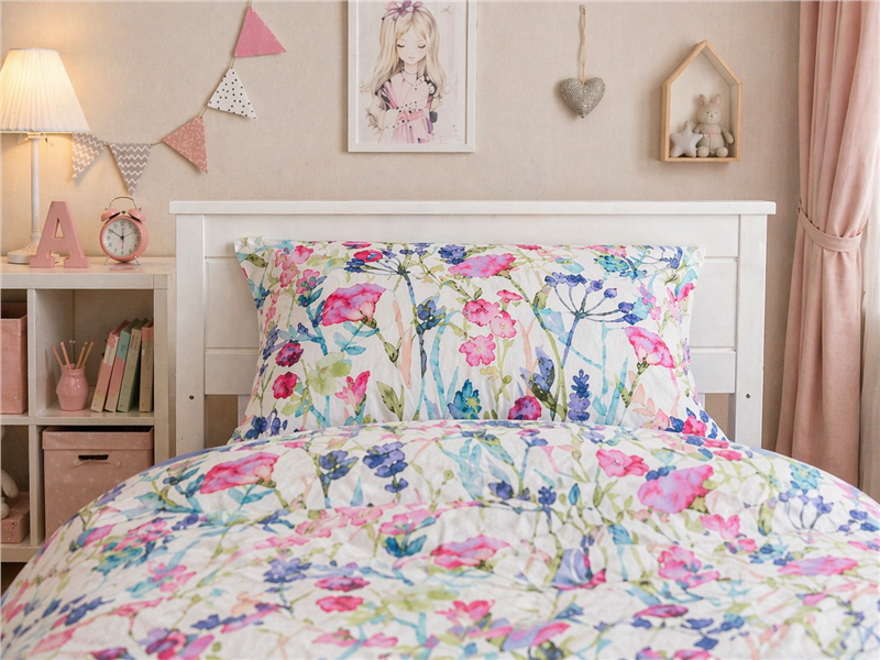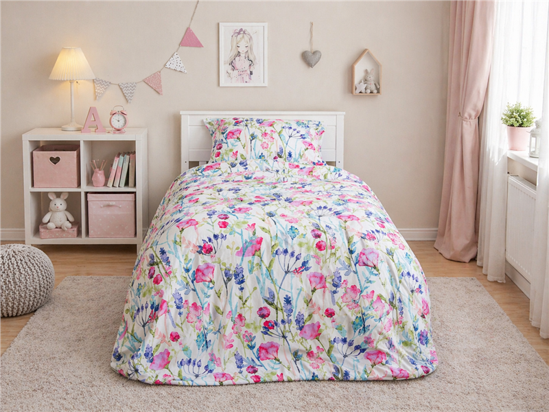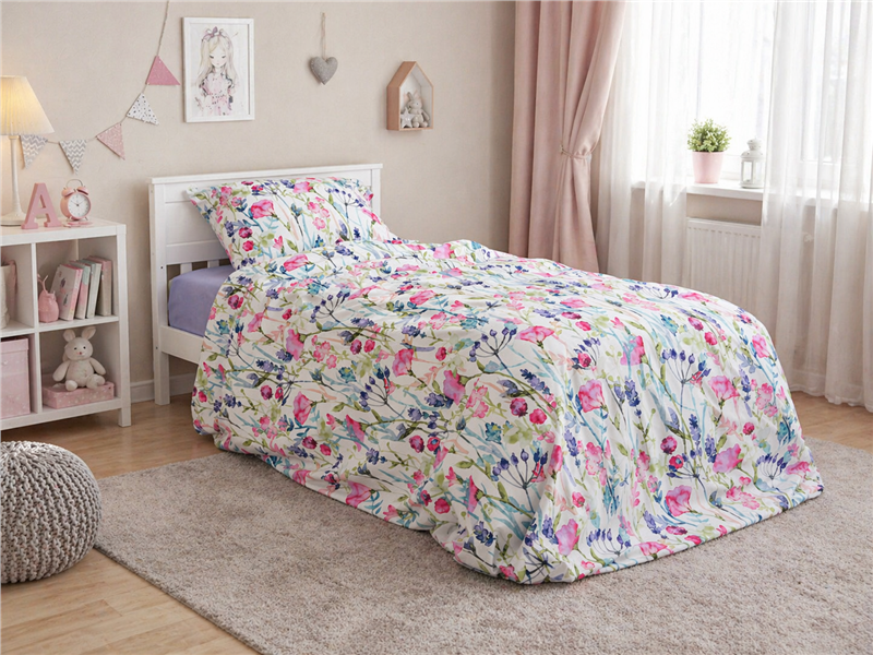 Комплект «Полевые Цветы» наполнит детскую комнату свежестью, нежностью и атмосферой летнего утра. Лёгкий цветочный принт с яркими бутонами и тонкими веточками создаёт ощущение уюта, спокойствия и красоты. Будто окно открыто в сад, а не в очередной день с бесконечными делами.
