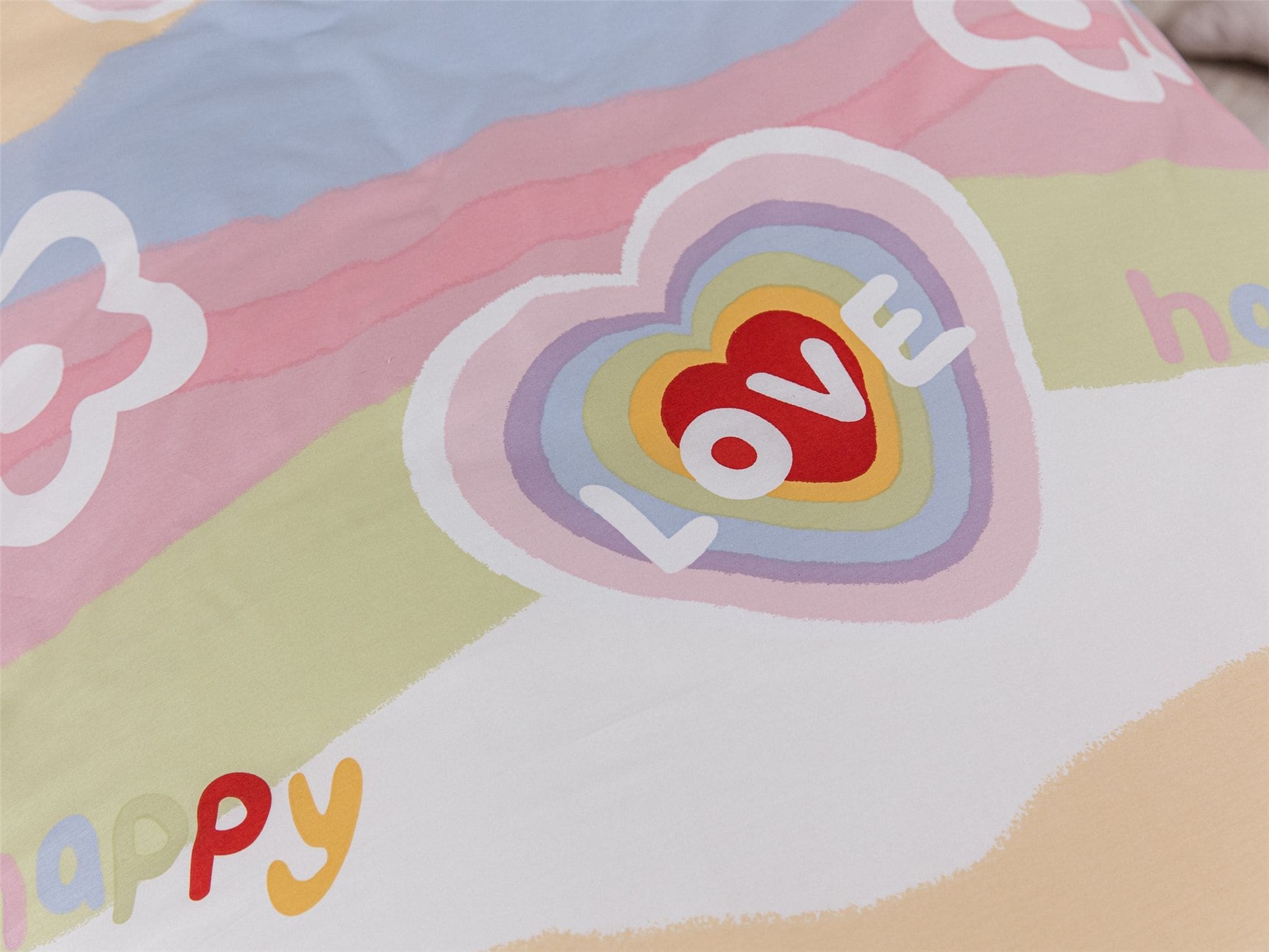 Погрузите ребёнка в атмосферу нежности, уюта и сказки! Комплект постельного белья «Happy Love» создан специально для девочек, которые любят всё яркое, доброе и волшебное. Радужные сердечки, милые надписи и пастельные облака на мягком сатине подарят уют и отличное настроение с первых минут сна.