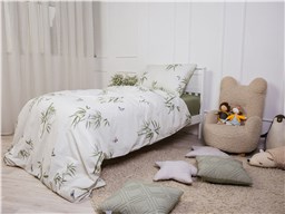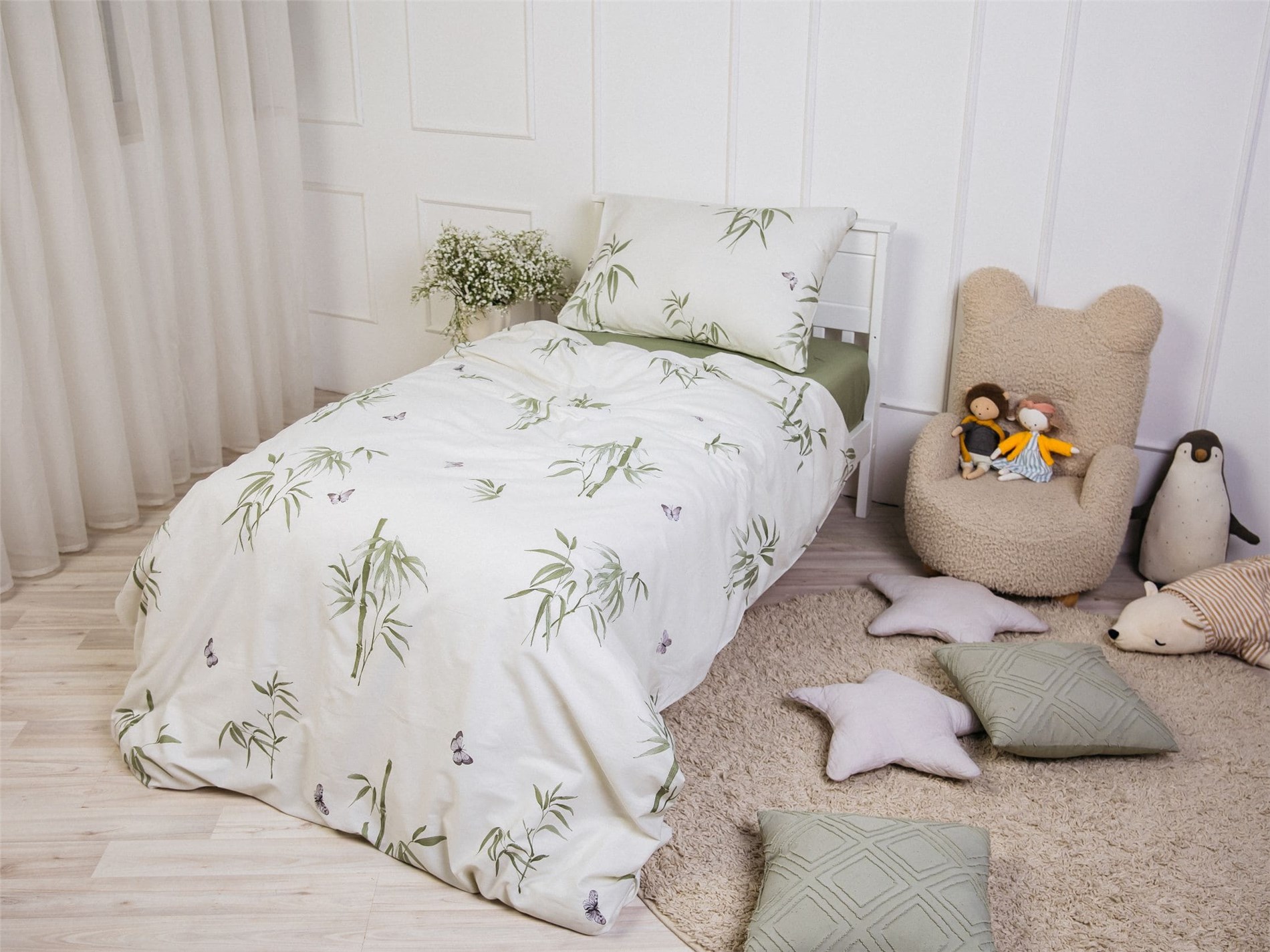 Мягкие оттенки белого и зелёного с изящным рисунком бамбуковых ветвей и порхающих бабочек наполняют комнату ощущением свежего утра и естественной гармонии.