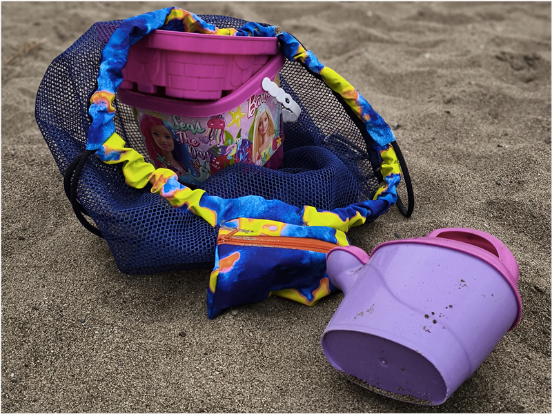 Рюкзак изготовлен из прочной однослойной галантерейной сетки с ячейками от 0,5×0,5 до 3,6×5 мм — песок и мелкий мусор высыпаются самопроизвольно, оставляя только игрушки и нужные вещи.