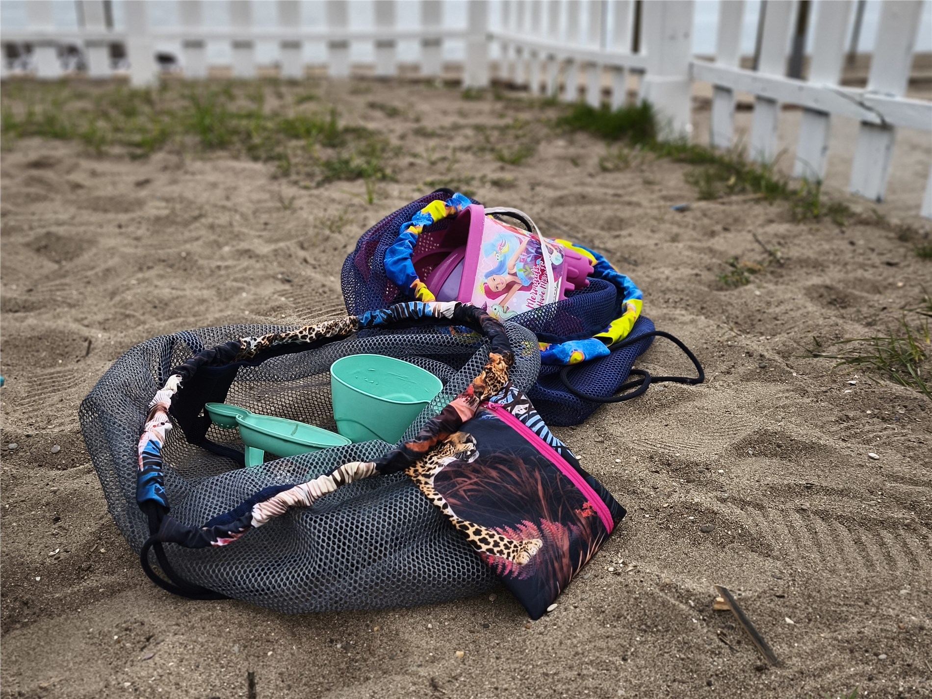 Рюкзак изготовлен из прочной однослойной галантерейной сетки с ячейками от 0,5×0,5 до 3,6×5 мм — песок и мелкий мусор высыпаются самопроизвольно, оставляя только игрушки и нужные вещи.