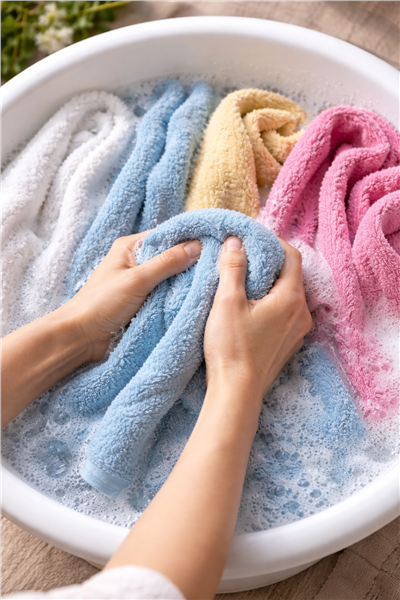 1. Погрузите полотенца в емкость с теплой водой и жидким моющим средством на 40 минут. Если жидкого средства нет, возьмите хозяйственное мыло, только не забудьте измельчить его на терке.